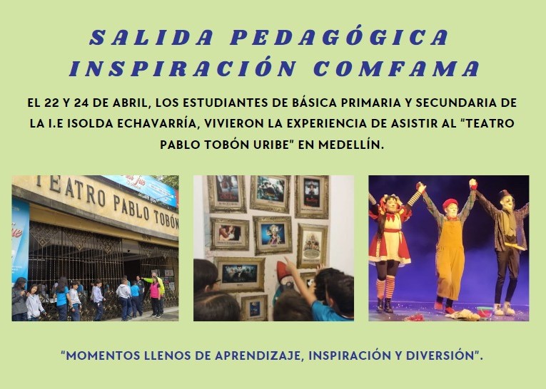 El 22 y el 24 de abril, los estudiantes de básica primaria y secundaria de la I.E ISOLDA ECHAVARRÍA, vivieron la experiencia de asistir al TEATRO PABLO TOBÓN URIBE en Medellín. ...