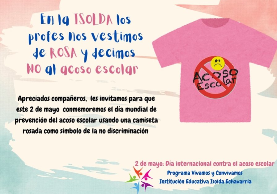 Hoy conmemoramos el día mundial de prevención del acoso escolar, usando una camiseta rosada como símbolo de la no discriminación. Los profes nos vestimos de rosa y decimos NO AL ACOSO ESCOLAR. ...