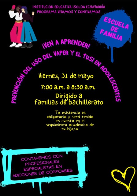 Les invitamos a la escuela de familia sobre la prevención del uso del vaper y el tusi en adolescentes, dirigido a familias de Bachillerato. ...