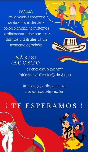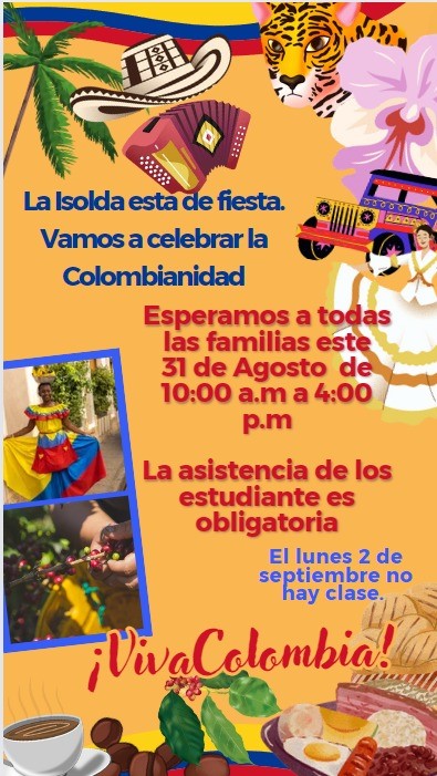 Invitación a celebrar la Colombianidad en nuestra Institución Educativa ISOLDA ECHAVARRÍA el día sábado 31 de agosto. Los esperamos en el horario de 10:00a.m a 4:00p.m. VIVA COLOMBIA ...