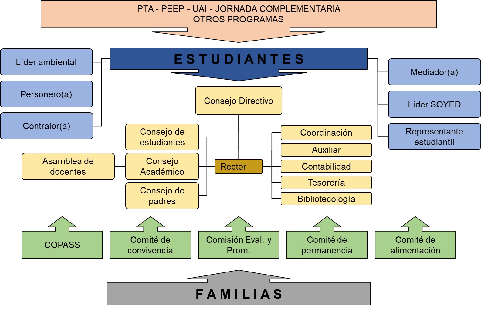 El siguiente organizador gráfico permite visualizar la estructura organizativa de la Institución Educativa Rafael Uribe Uribe evidenciando sus instancias de liderazgo, la función que desempeñan y las relaciones que se establecen entre ellas, es decir, la articulación que se establece entre los diversos miembros que forman parte del gobierno escolar y la comunidad en general.