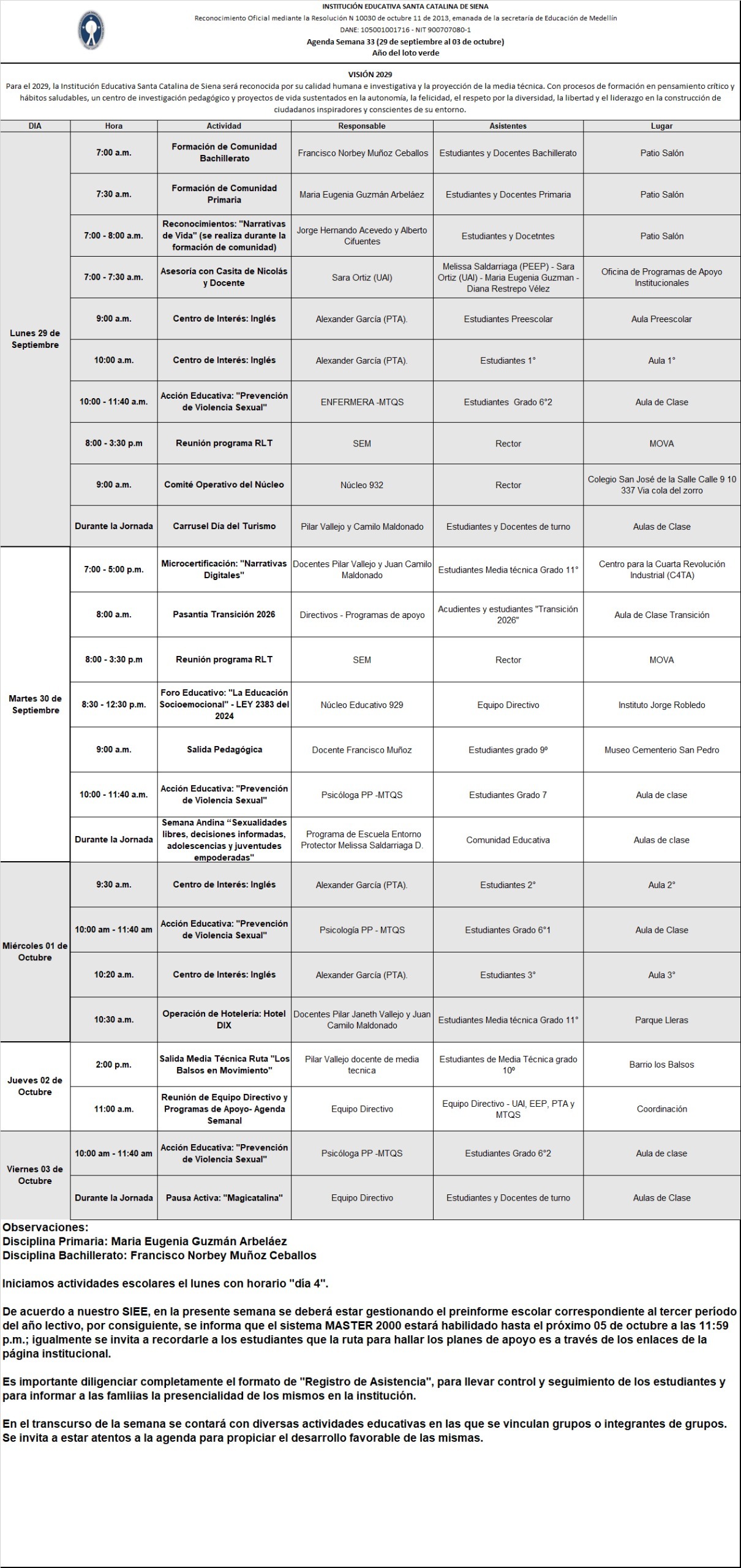 - Agenda semana 33 del 29 de septiembre al 3 de octubre de 2025