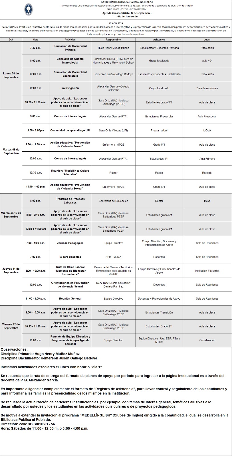 - Agenda semana 30 del 09 de septiembre al 13 de 2024