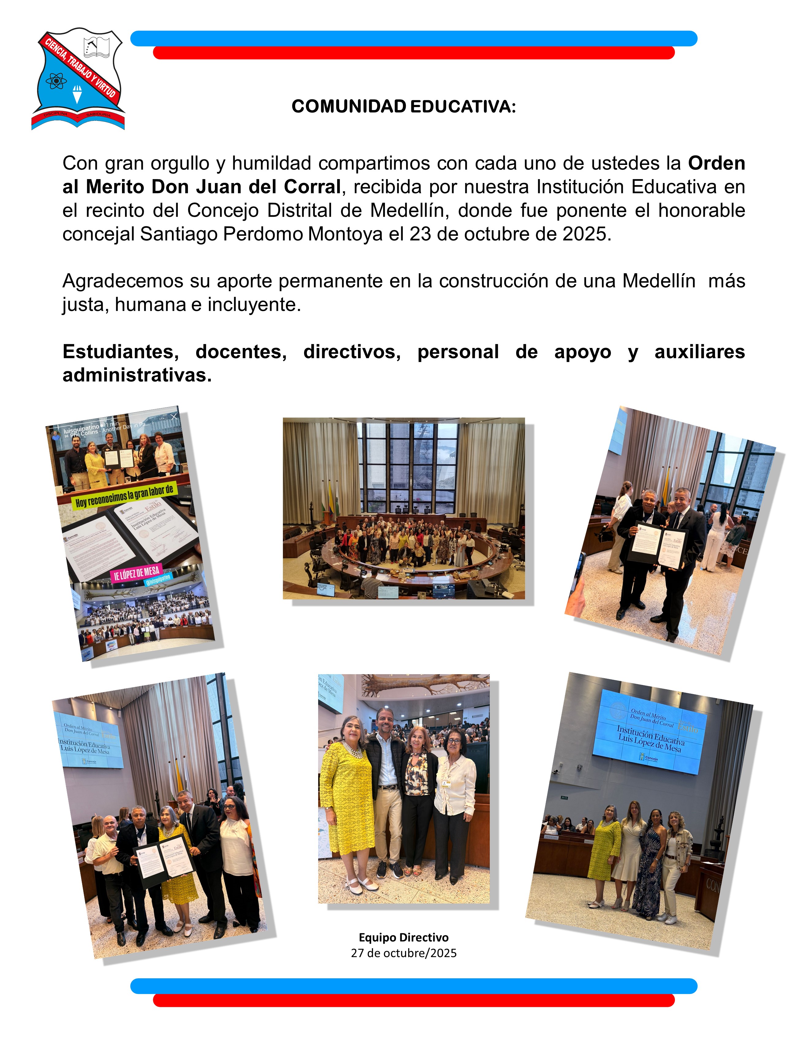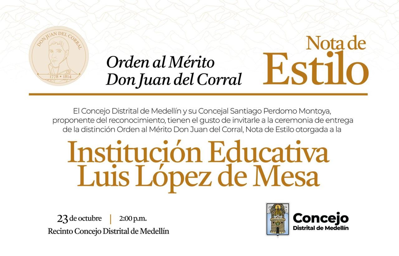 El próximo jueves, 23 de octubre/2025 a la 1:30 p.m., la Institución Educativa recibe la "Orden al Mérito Don Juan Corral", en nota de estilo, en el recinto del Concejo Distrital de Medellín.