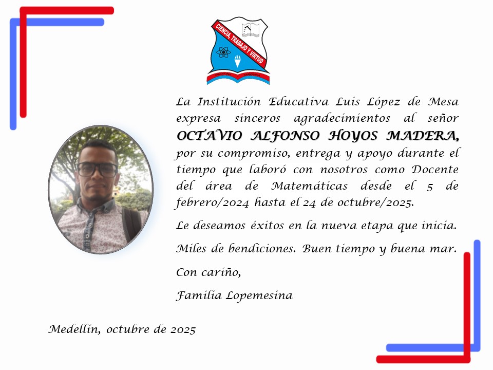 Estudiante lopemesino, lo invitamos a realizar la AUTOEVALUACION DEL TERCER PERIODO 2024. ELlink estara habilitado hasta el dia lunes 25 de noviembre/2024  alas 12:00 mediodia.