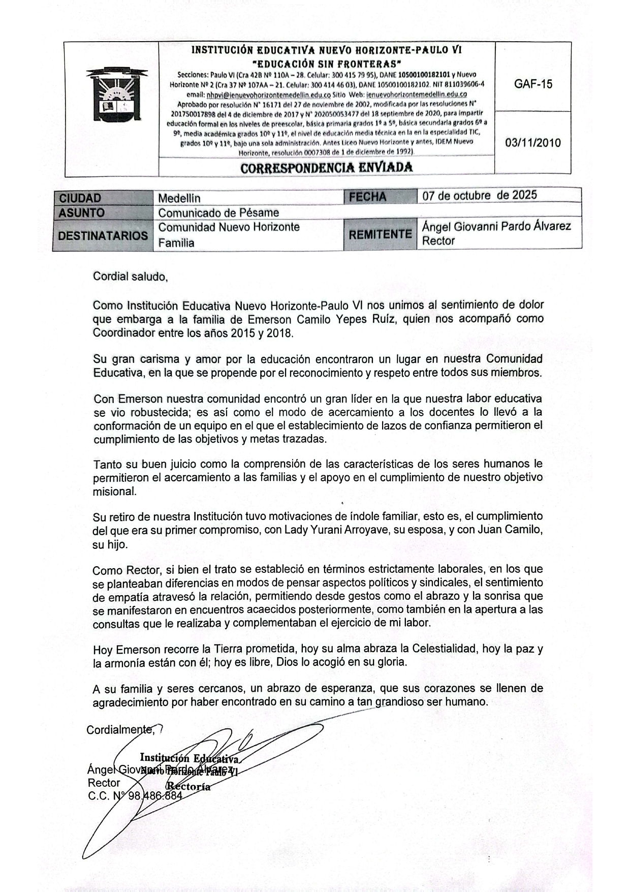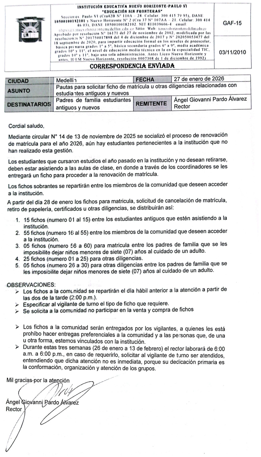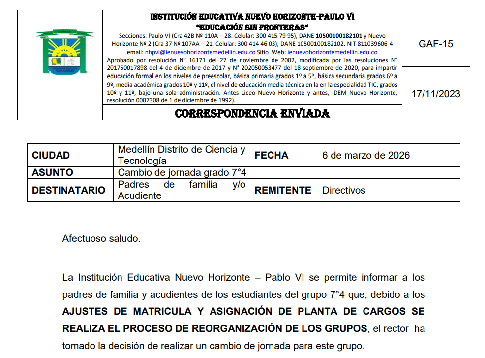 La IE Nuevo Horizonte Pablo VI informó que el grupo 7 4 pasará de la jornada de la tarde a la mañana desde el 9 de marzo de 2026, debido a la reorganización de grupos por ajustes de matrícula y planta docente. ...