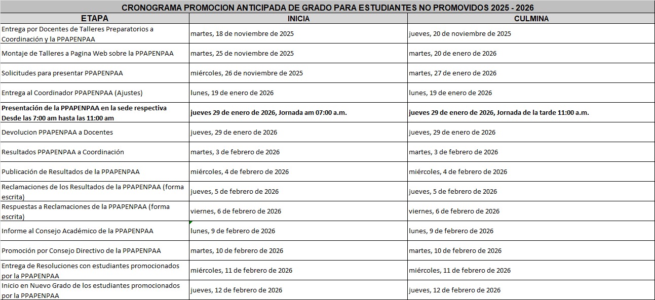 Cronograma Promoción Anticipada de Grado para Estudiantes No Promovidos 2025-2026