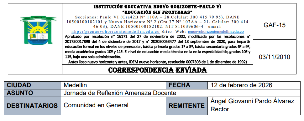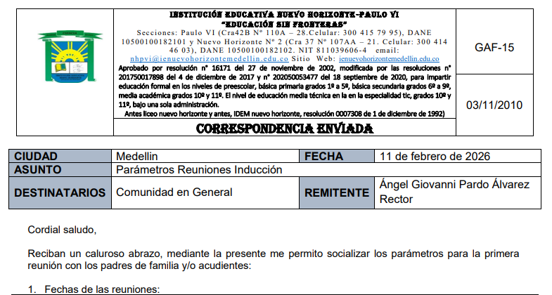 La Institución Educativa Nuevo Horizonte Paulo VI realizará su Escuela de Padres del primer periodo 2026 los días 10 y 11 de marzo. ...