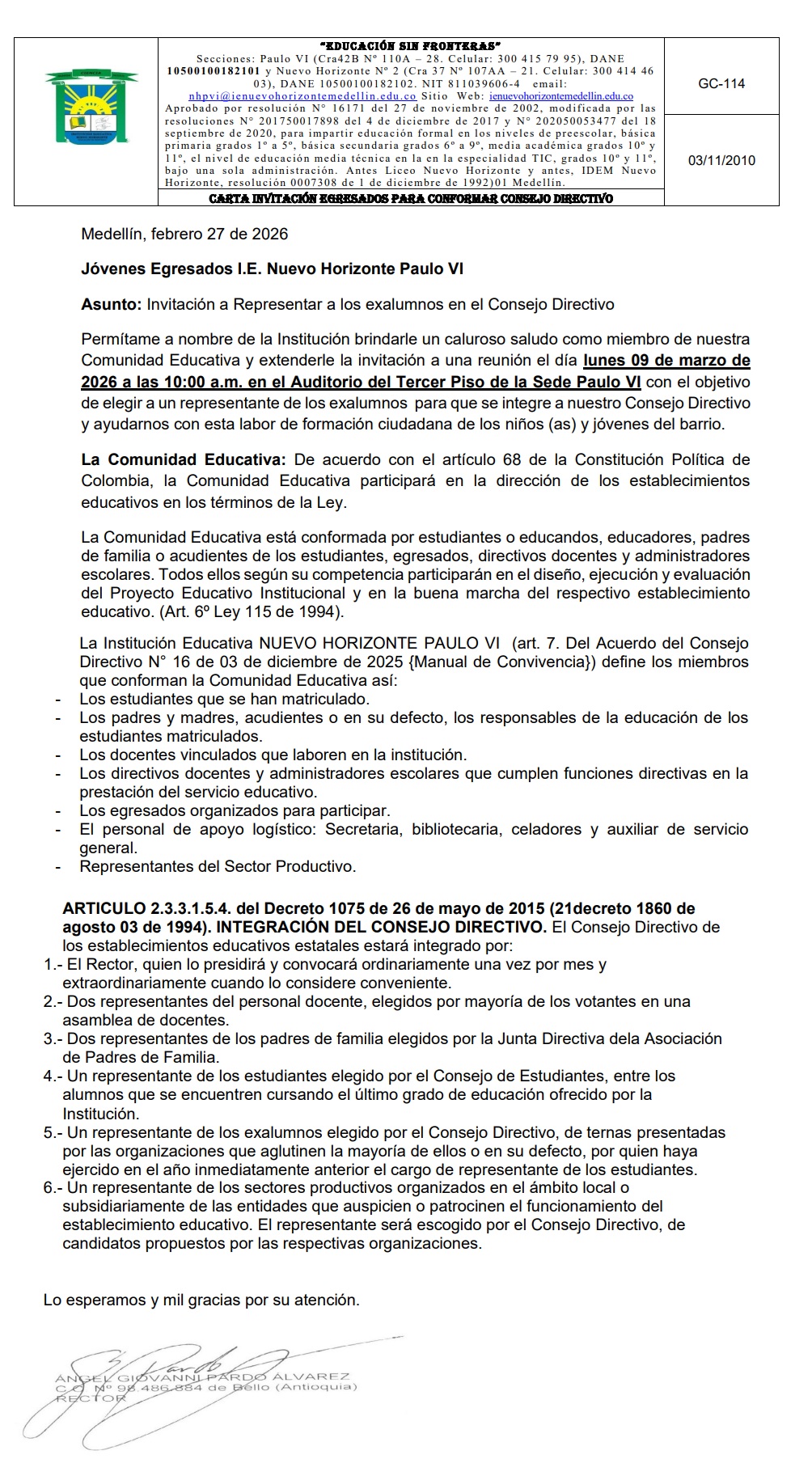 La Institución Educativa Nuevo Horizonte Paulo VI extendió una invitación oficial a sus jóvenes egresados para participar en la elección del representante de exalumnos ante el Consejo Directivo. ...
